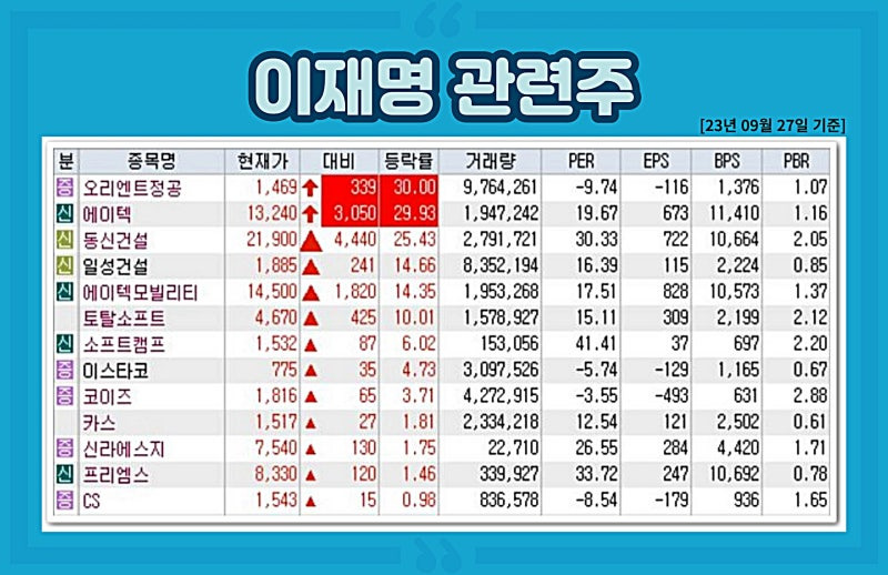 - 오리엔트정공(065500) : 이재명 대표가 과거 일했던 시계공장과 관련된 기업 입니다.